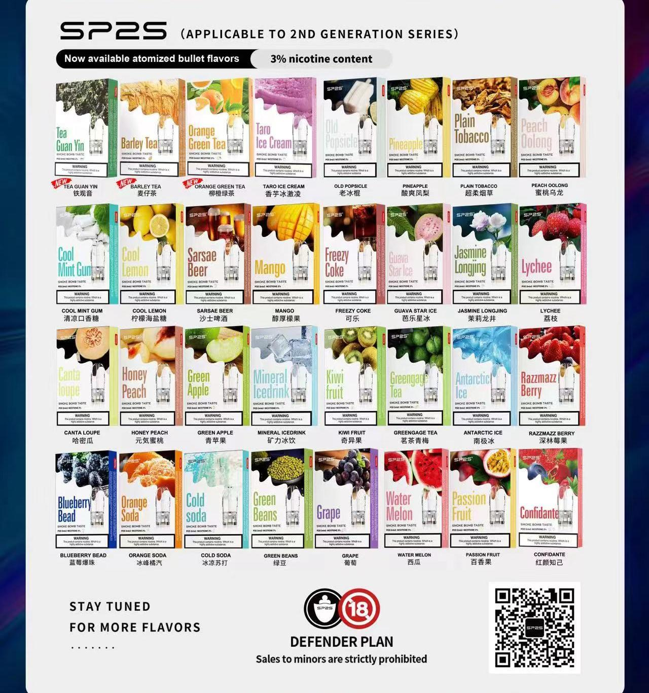 SP2口味:百香果, 葡萄, 綠豆, 西瓜,(口香糖停產), (茉莉龍井停產), 元氣蜜桃, 可樂, 蜜桃烏龍, 檸檬海鹽, 寶礦力, 冰棍, 沙士, 荔枝, 芭樂, 超柔煙草, 南極冰, 青蘋果, 哈密瓜, 莓果, 青梅, 藍莓爆珠, 冰峰橘汽, (草莓奶冰停產), (奇異果停產), 冰涼蘇打, 鳳梨, 芒果, 鐵觀音, 柳橙綠茶, 麥仔茶, 紅粉知己
